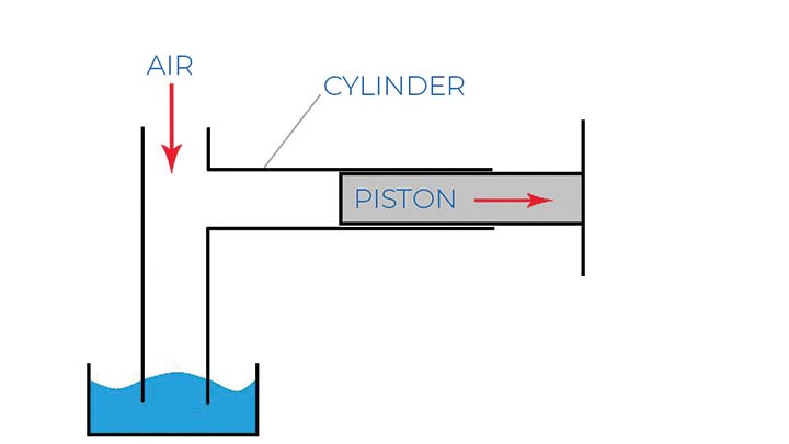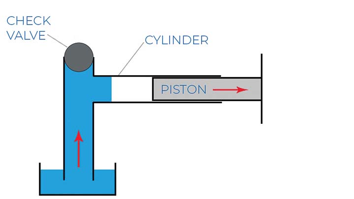 以同樣的方式,泵中的隔膜向泵體內(nèi)和向外移動(dòng),與止回閥一起工作以吸入和排出泵中的流體。下面的圖 2 顯示,如果沒(méi)有止回閥,當(dāng)活塞向外移動(dòng)時(shí),空氣會(huì)簡(jiǎn)單地流入氣缸,從而阻止任何吸入。
