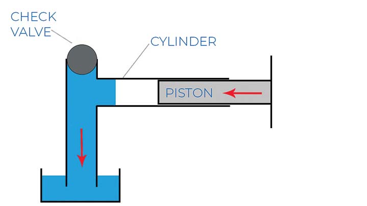 圖 3 顯示了用于防止流體流入氣缸的止回閥。這會(huì)在氣缸內(nèi)產(chǎn)生負(fù)壓,一旦活塞向外移動(dòng),就可以從底部吸取流體。
